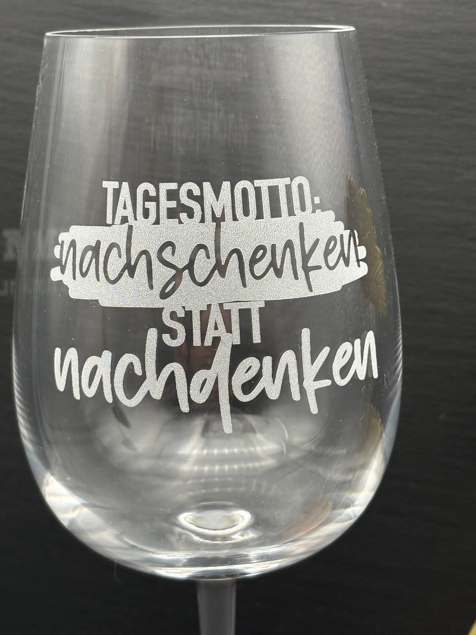 Graviertes Weinglas mit Spruch "Tagesmotto: nachschenken statt nachdenken"
