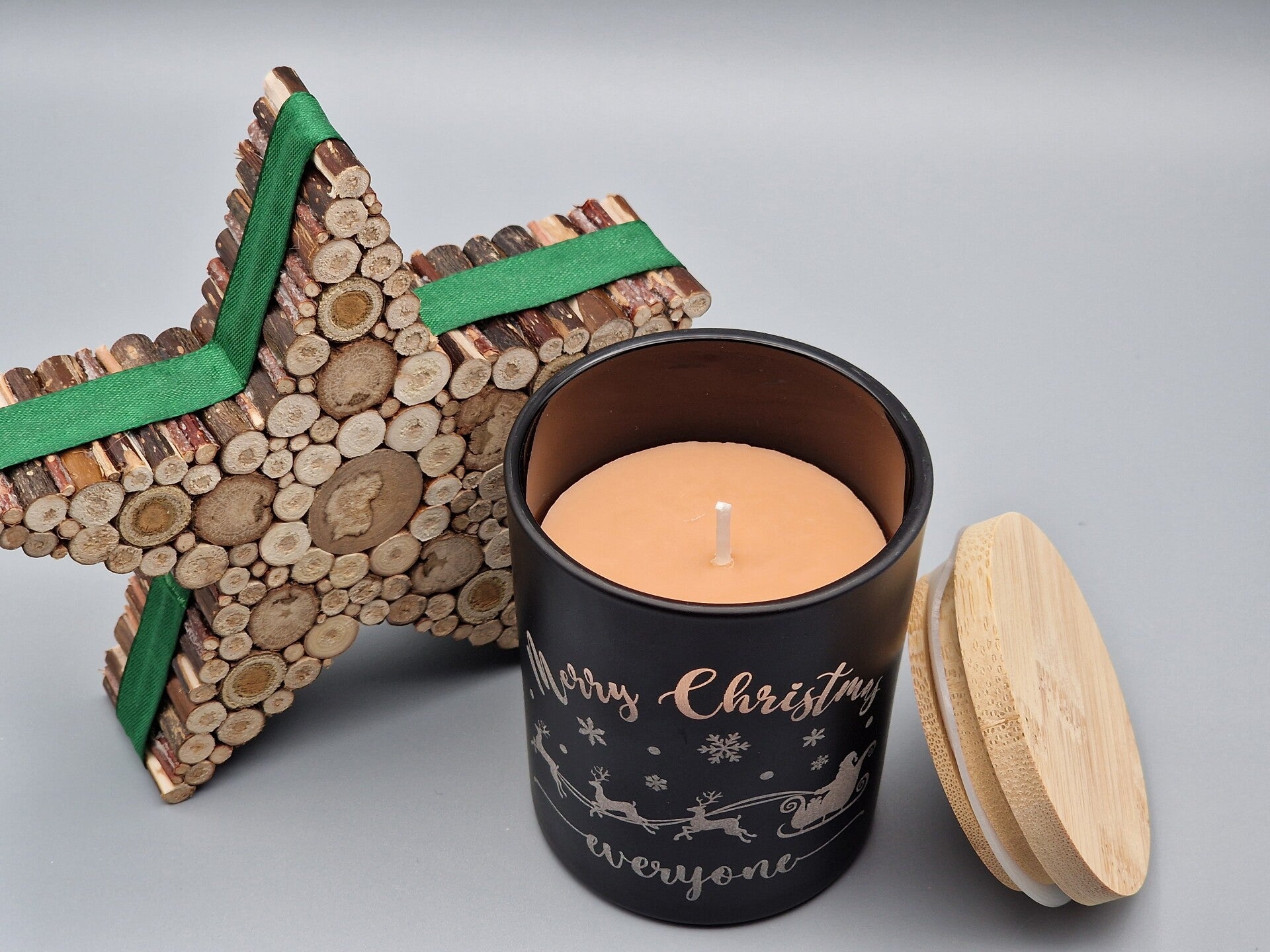 Das stilvolle schwarze Glas mit gravierter Schrift und Bambusdeckel schützt das wertvolle Aroma der Kerze, während die Gravur beim Abbrennen eine stimmungsvolle Beleuchtung erzeugt.