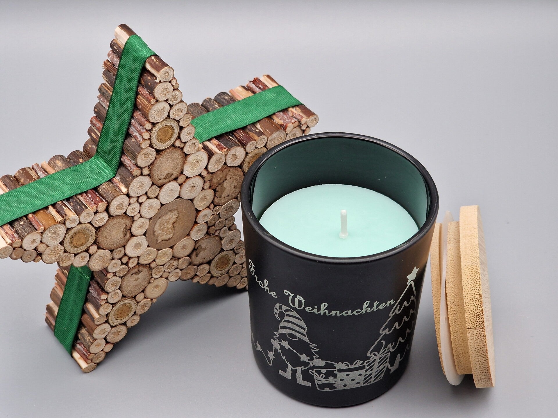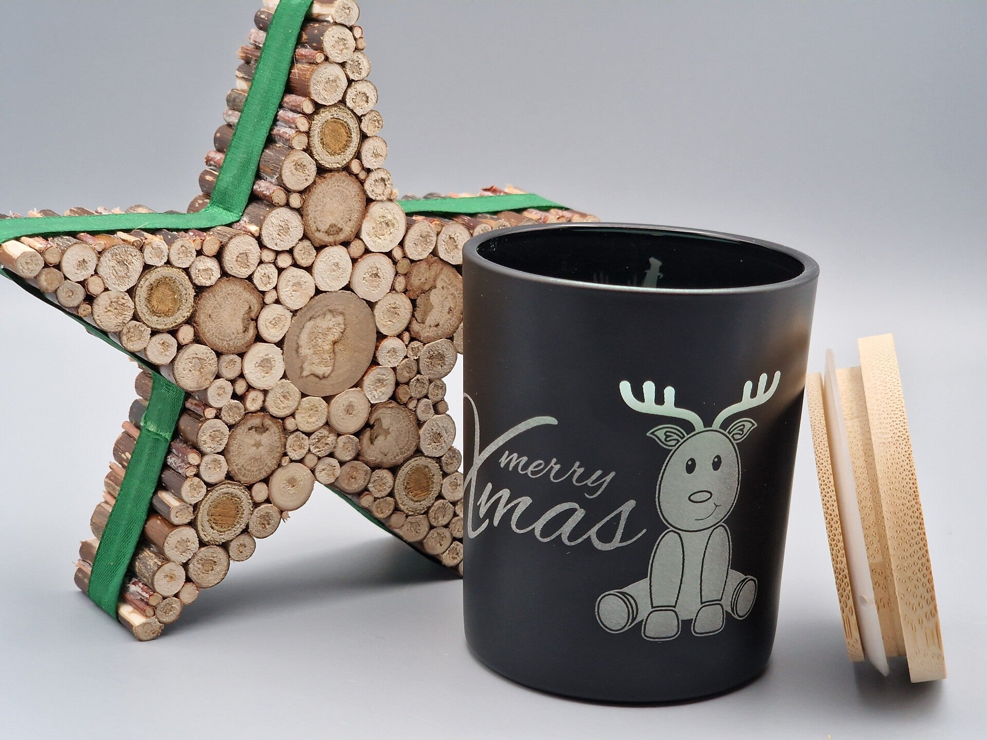 Das stilvolle schwarze Glas mit gravierter Schrift und Bambusdeckel schützt das wertvolle Aroma der Kerze, während die Gravur beim Abbrennen eine stimmungsvolle Beleuchtung erzeugt.