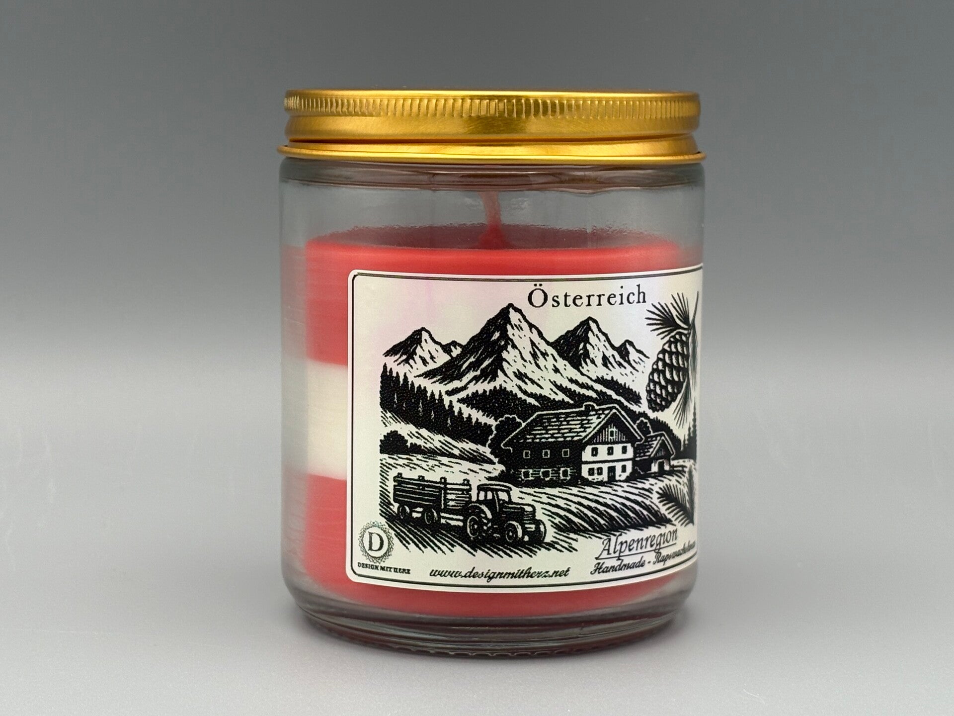 Unten: Die Herkunftsbezeichnung „Alpenregion“ sowie der Hinweis „Handmade – Rapswachskerze“ in klassischer Schrift